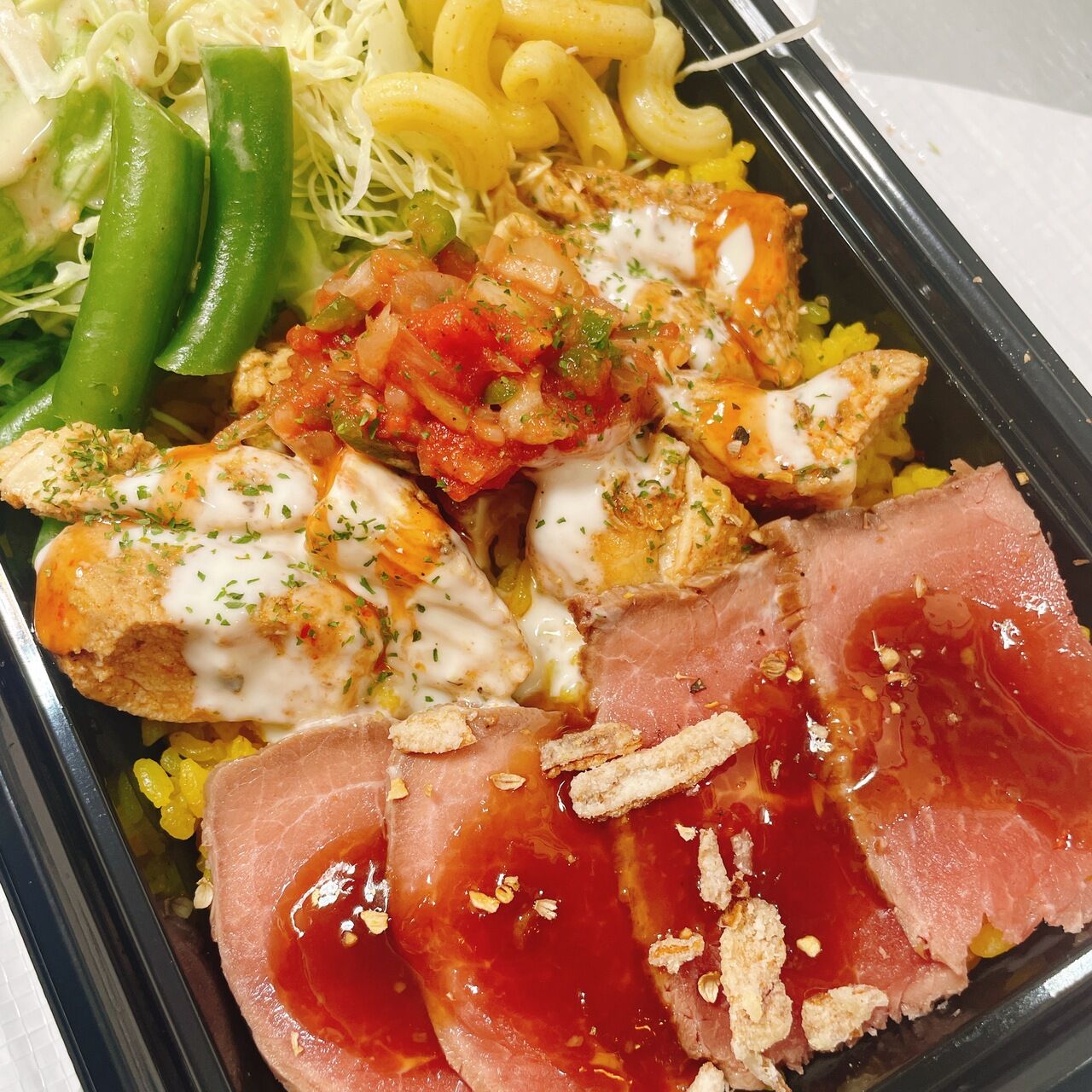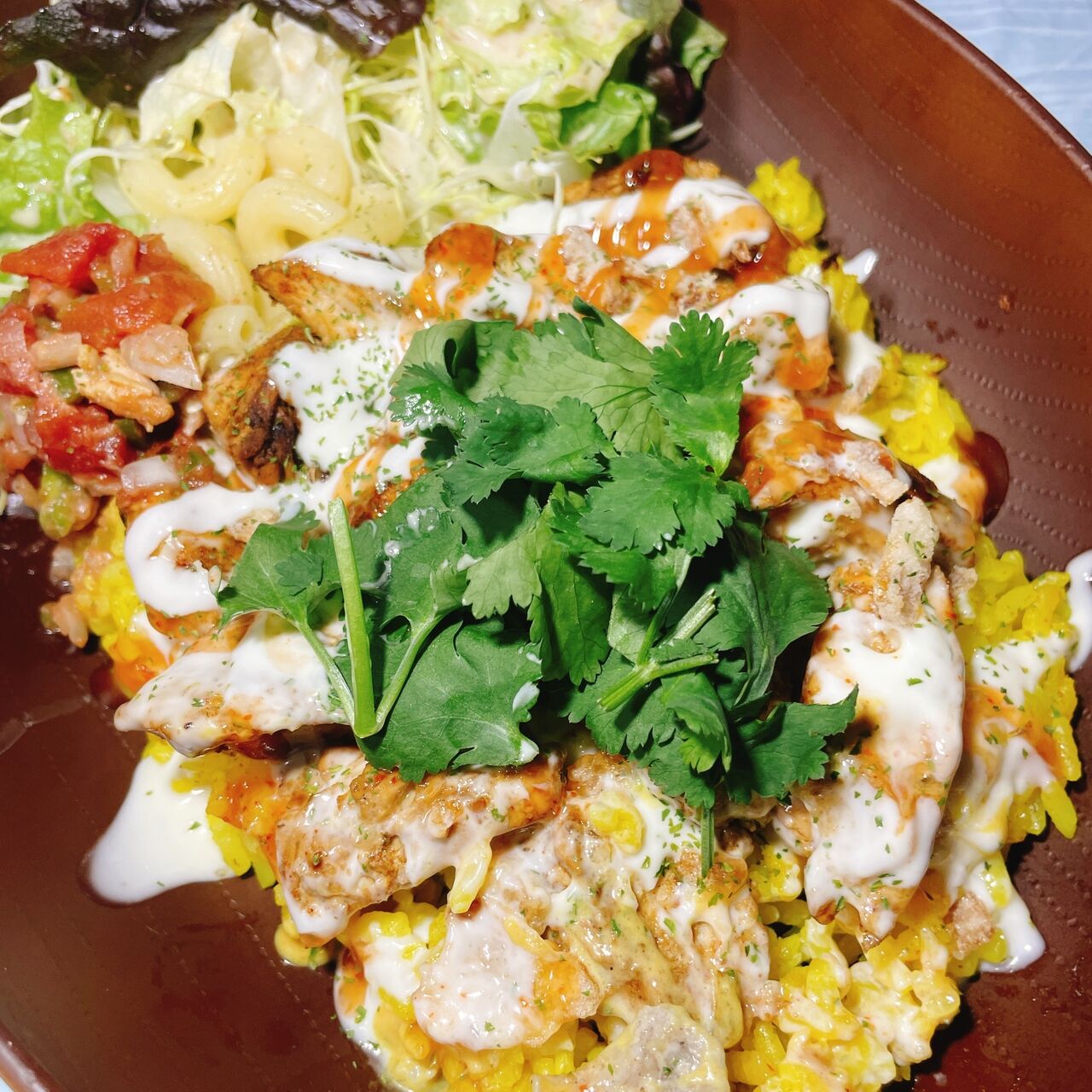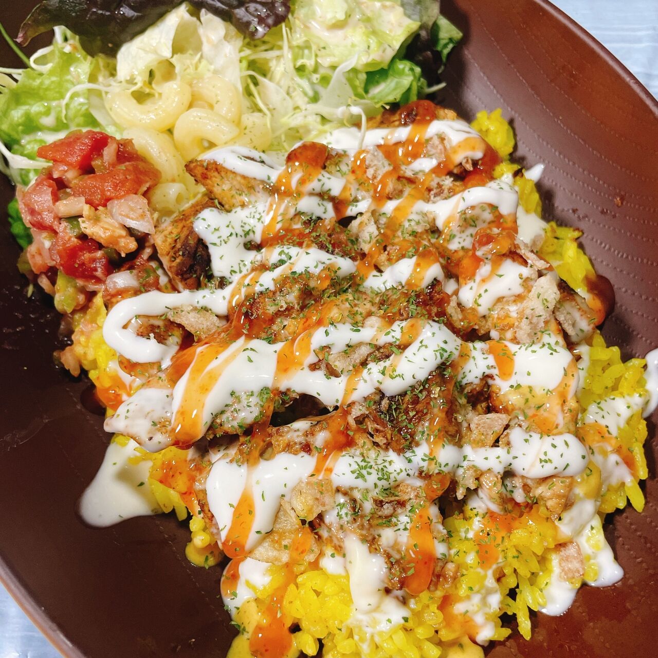 進化系地中海めし グリルドチキンは国産の鶏肉を使用しとても柔らかくジューシー ギリシャ風の白いソースと赤いソースが食欲をそそる トッピングあり