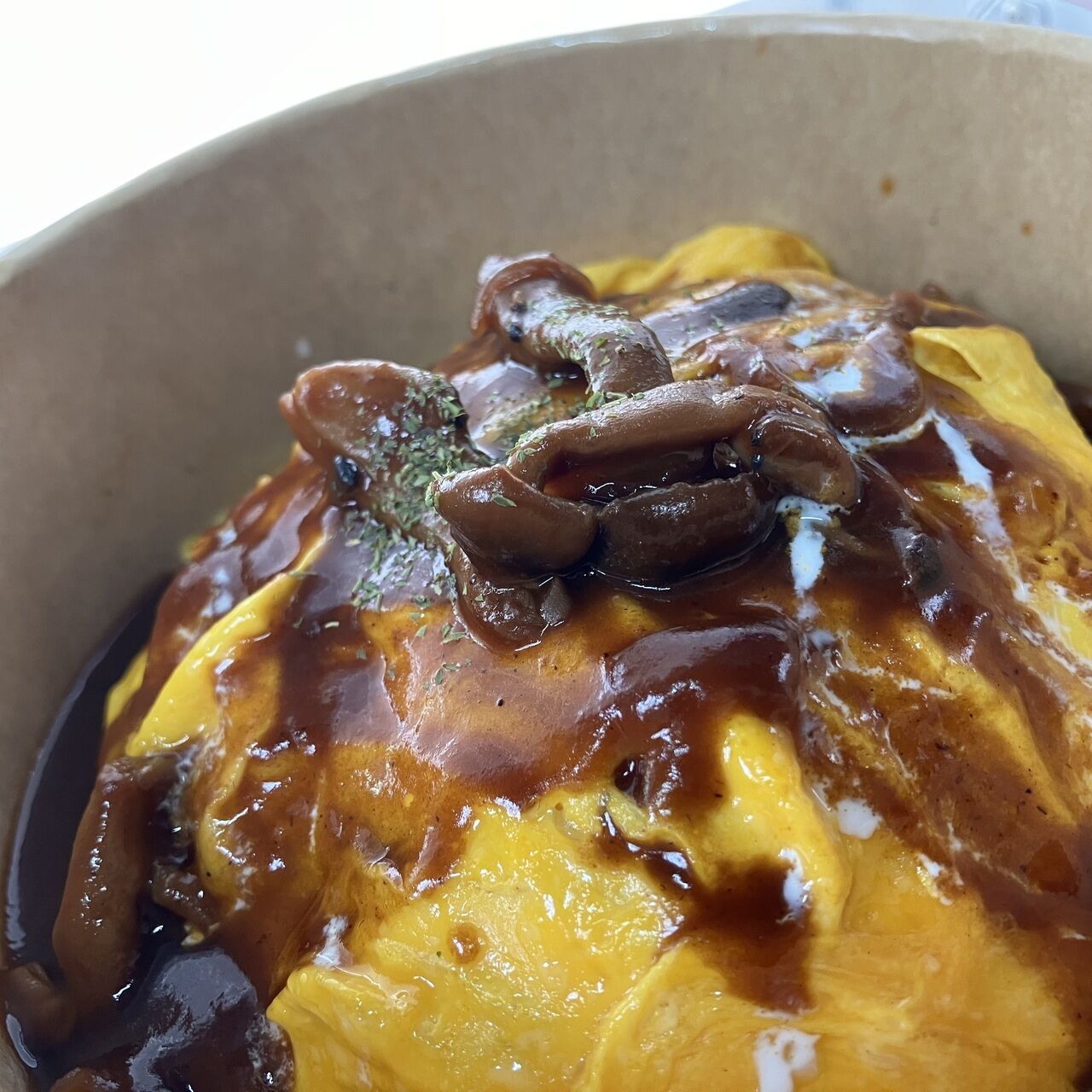 ダシとバターの風味が絶妙なマッチング。大葉、かいわれ、刻み海苔も添えた少しあっさりな和風オムライス。