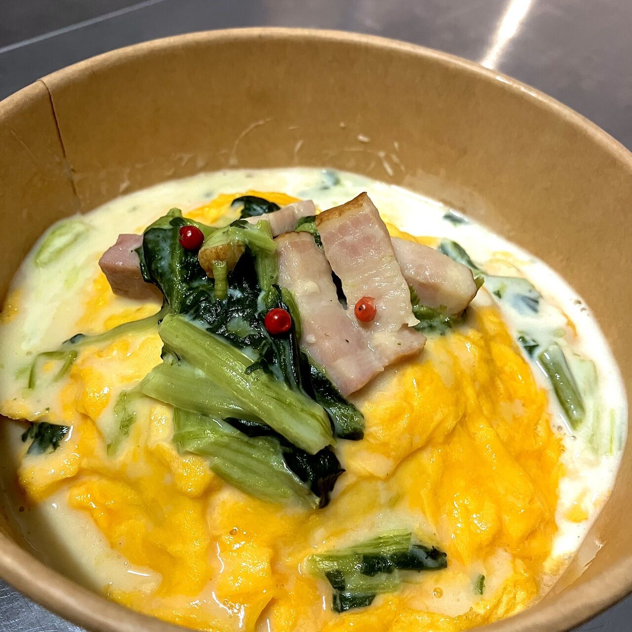 大きめにカットしたベーコンを使った食べ応えのある一品。ピンクペッパーがアクセント。