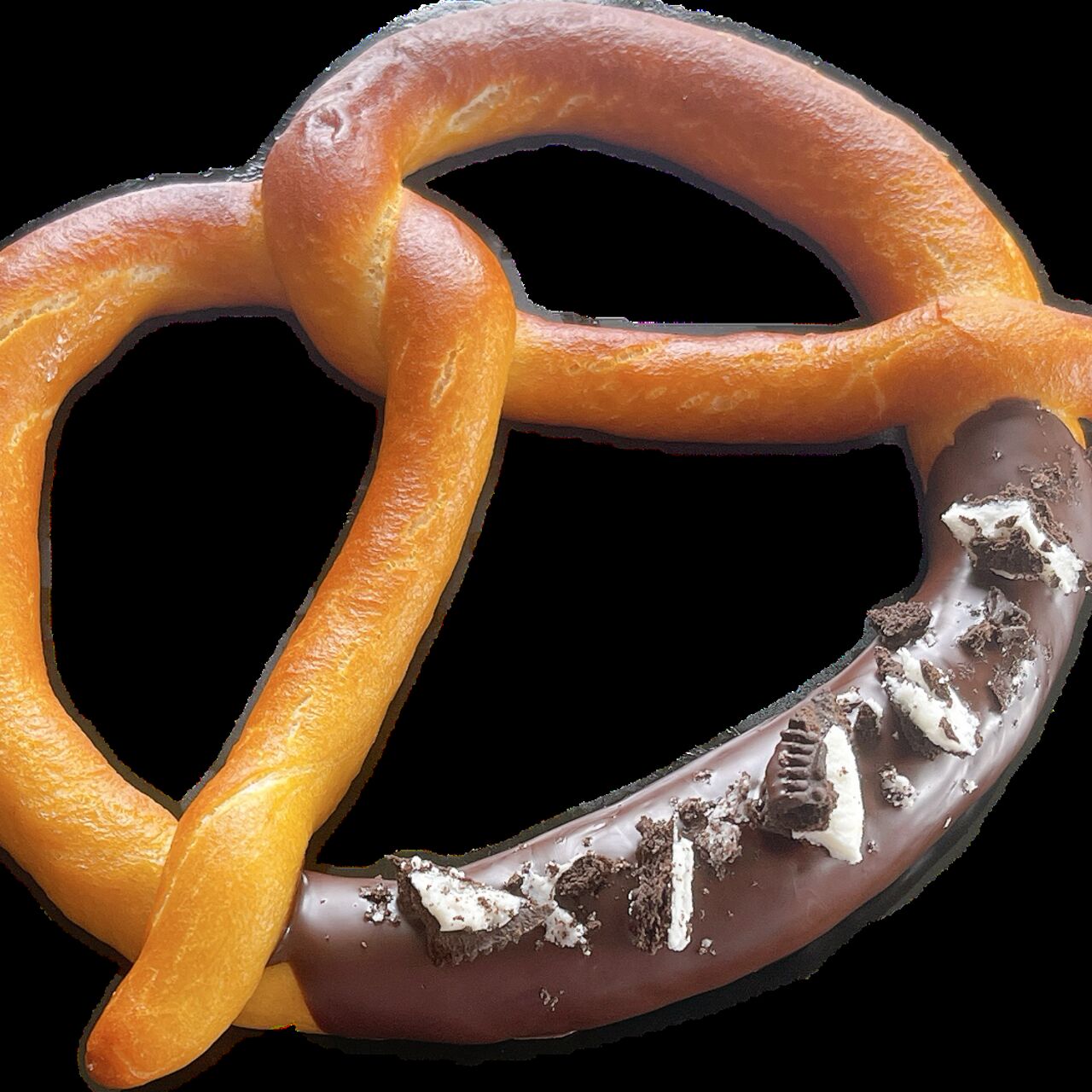米粉を使用したもっちもちのプレッツェルにミルクチョコとオレオをトッピング。