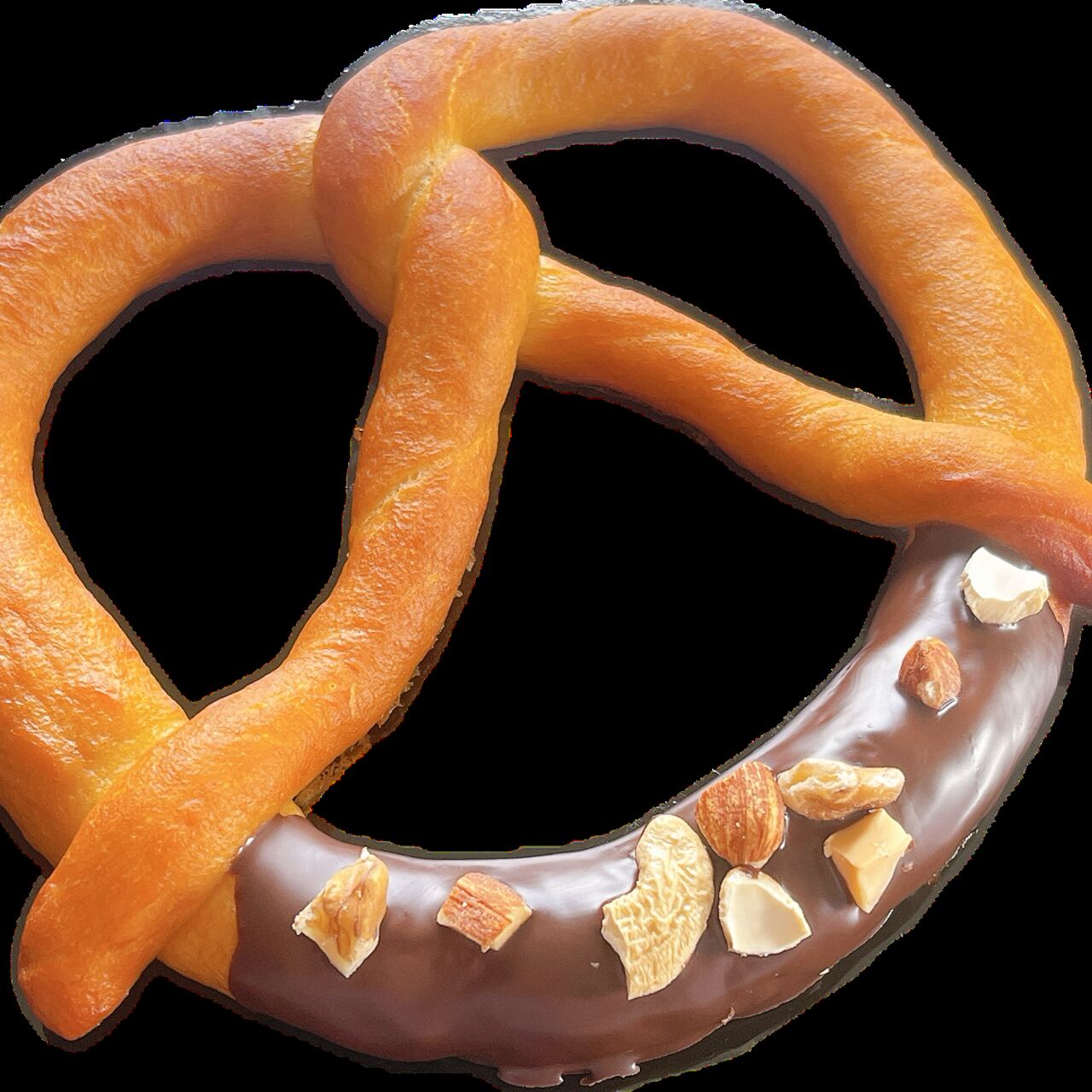 米粉を使用したもっちもちのプレッツェルにミルクチョコとナッツをトッピング。