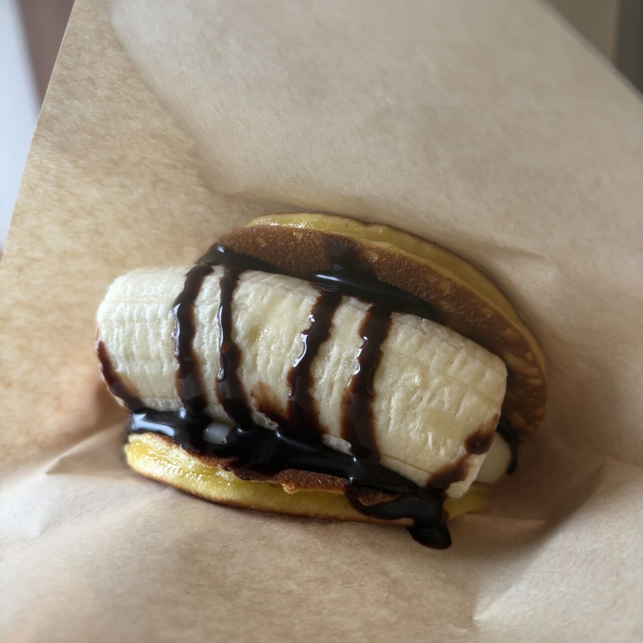どらやきの皮でチョコバナナと北海道ミルククリームをサンドしています。(あんこは入っていません)