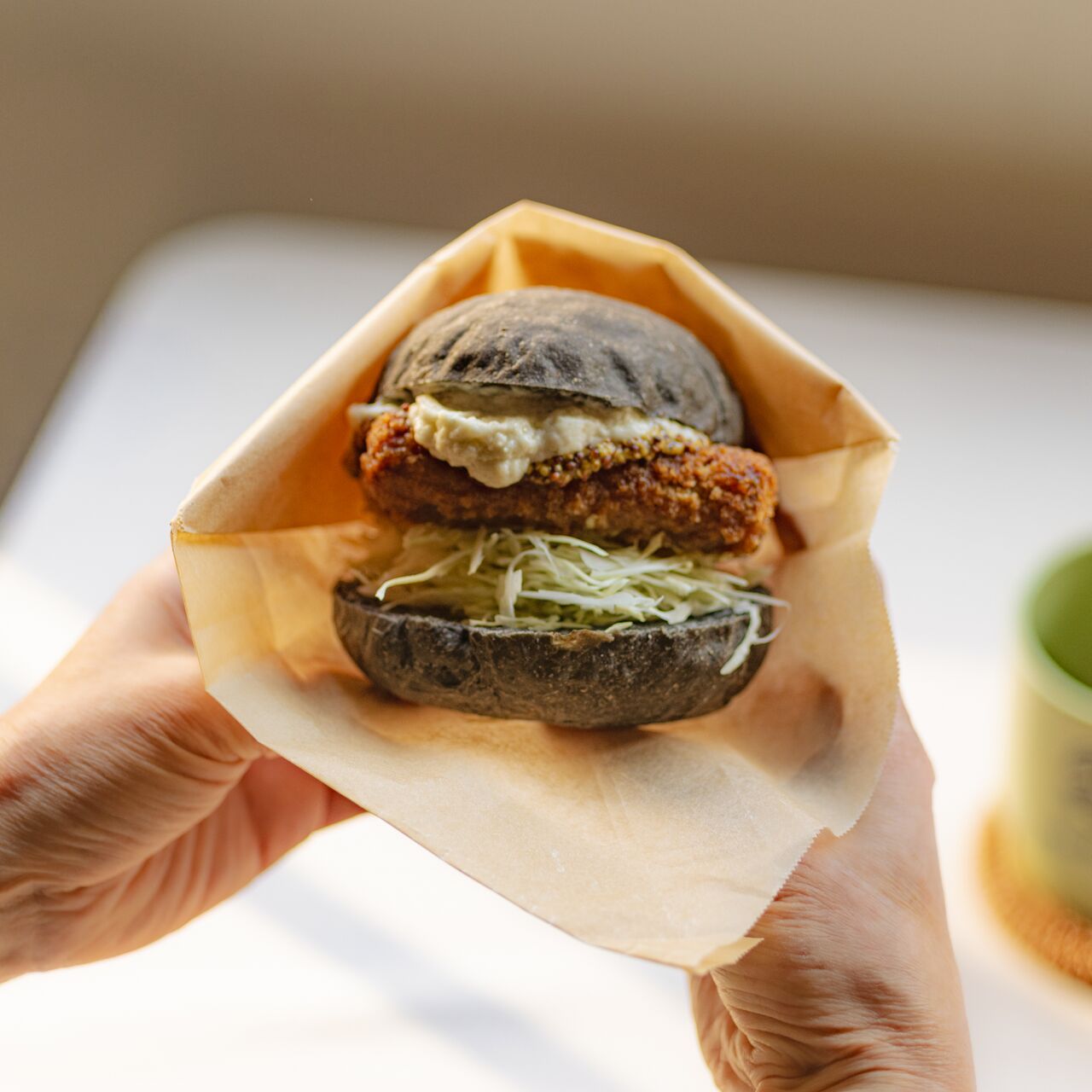 デトックス効果や腸内環境を整える麻炭入りパンで挟みました