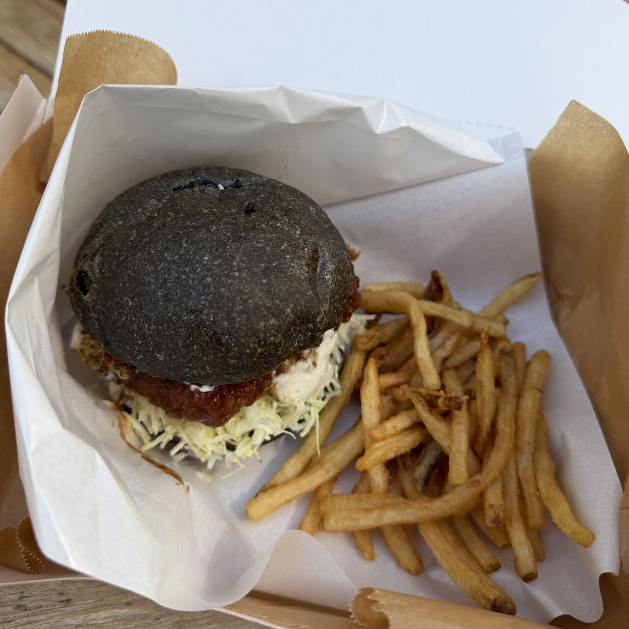 麻炭パンのテンペカツバーガーとフライドポテトセット