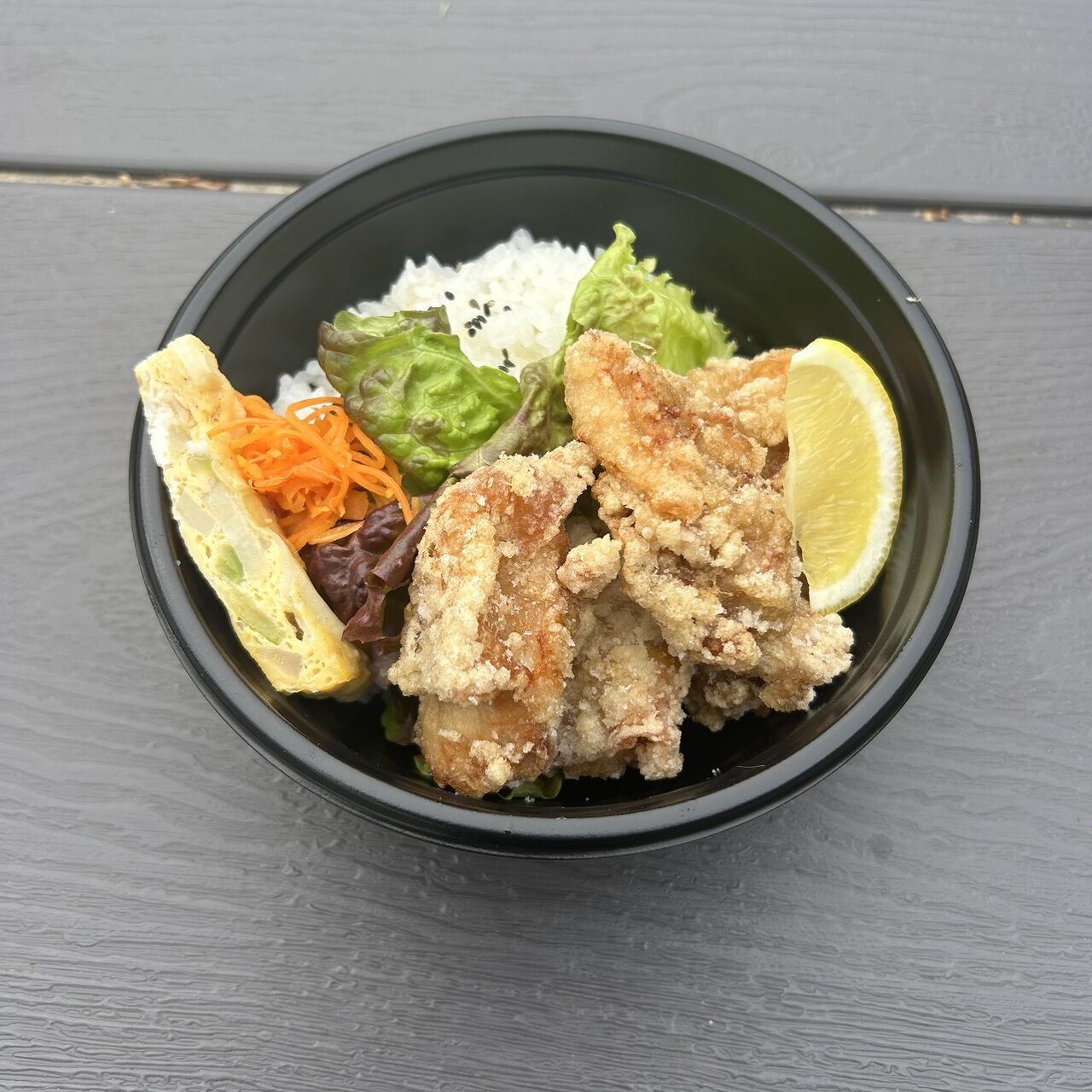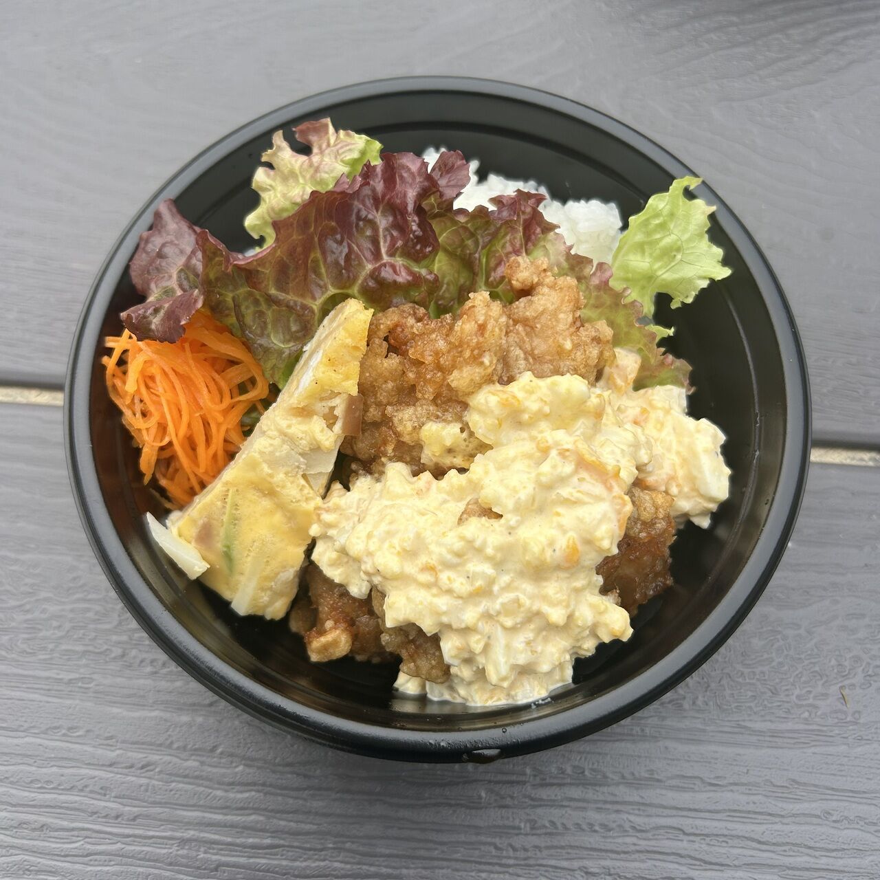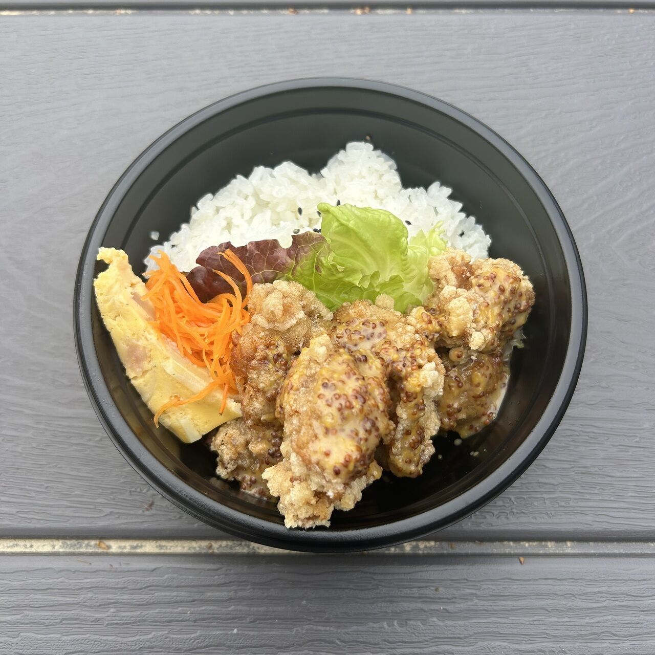 唐揚げに甘辛いタレをかけ、マヨネーズをトッピングした丼です。