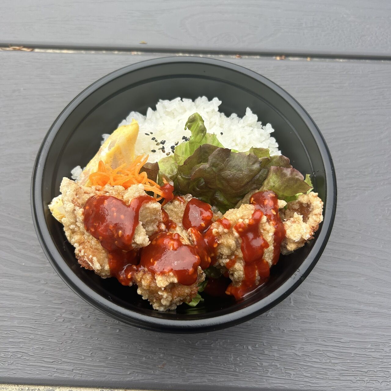 唐揚げに手作りのピリ辛のヤンニョムソースをかけたお弁当です。
