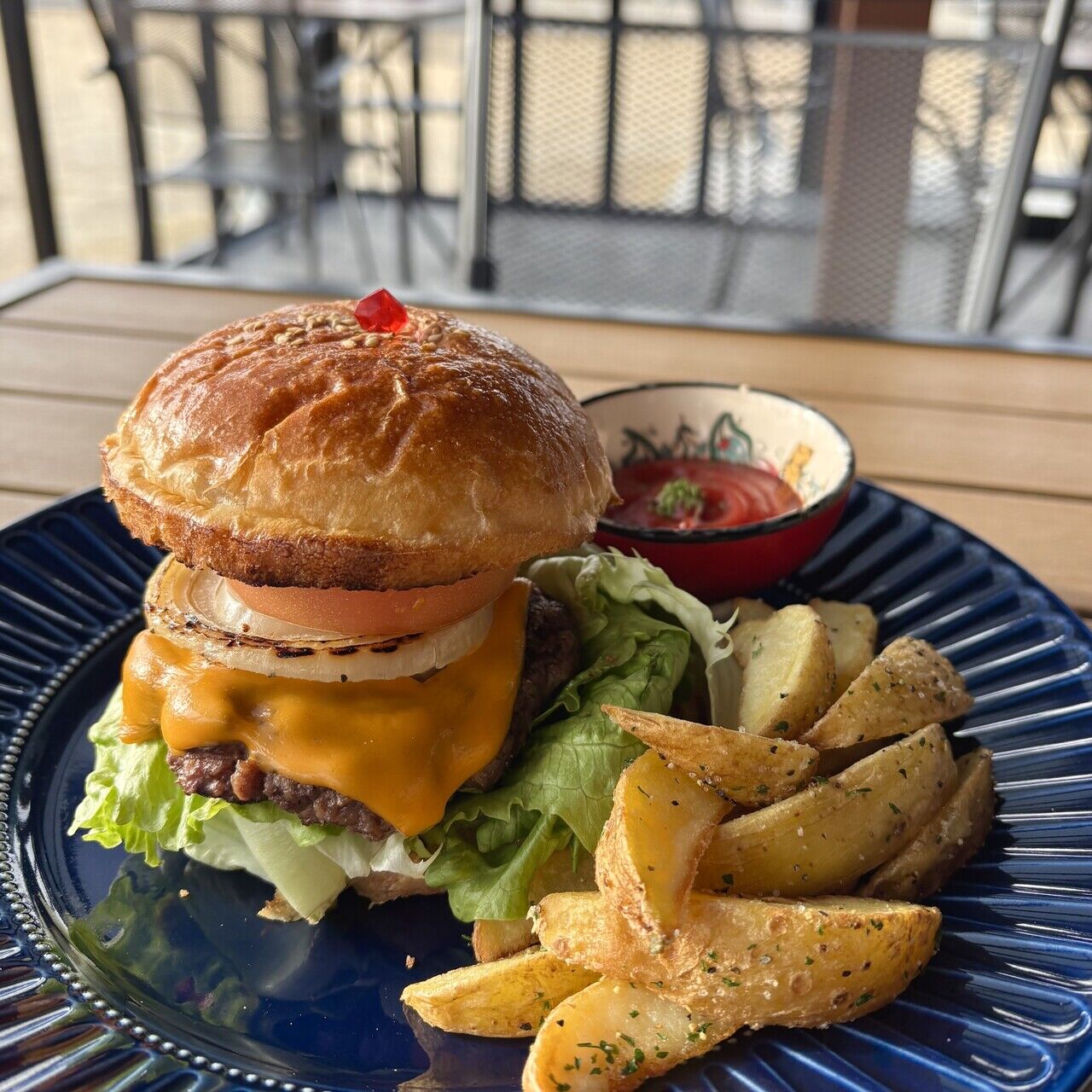 上州牛を使った粗挽きのパティと、丁寧に焼き上げたバンズ、特製バーガーソースを合わせたオリジナルバーガーです。フレンチフライがセットになってます。
