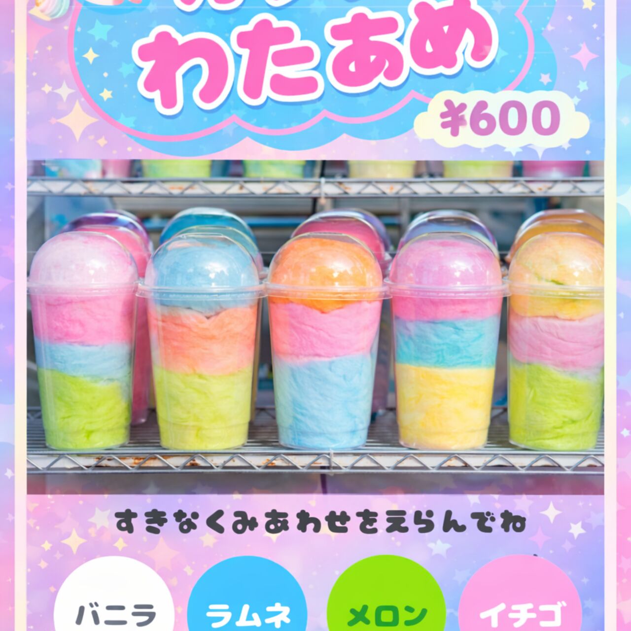 お子様に喜ばれSNS映えにもってこいのカラフルわたアメ味も付いてて美味しいですよ!