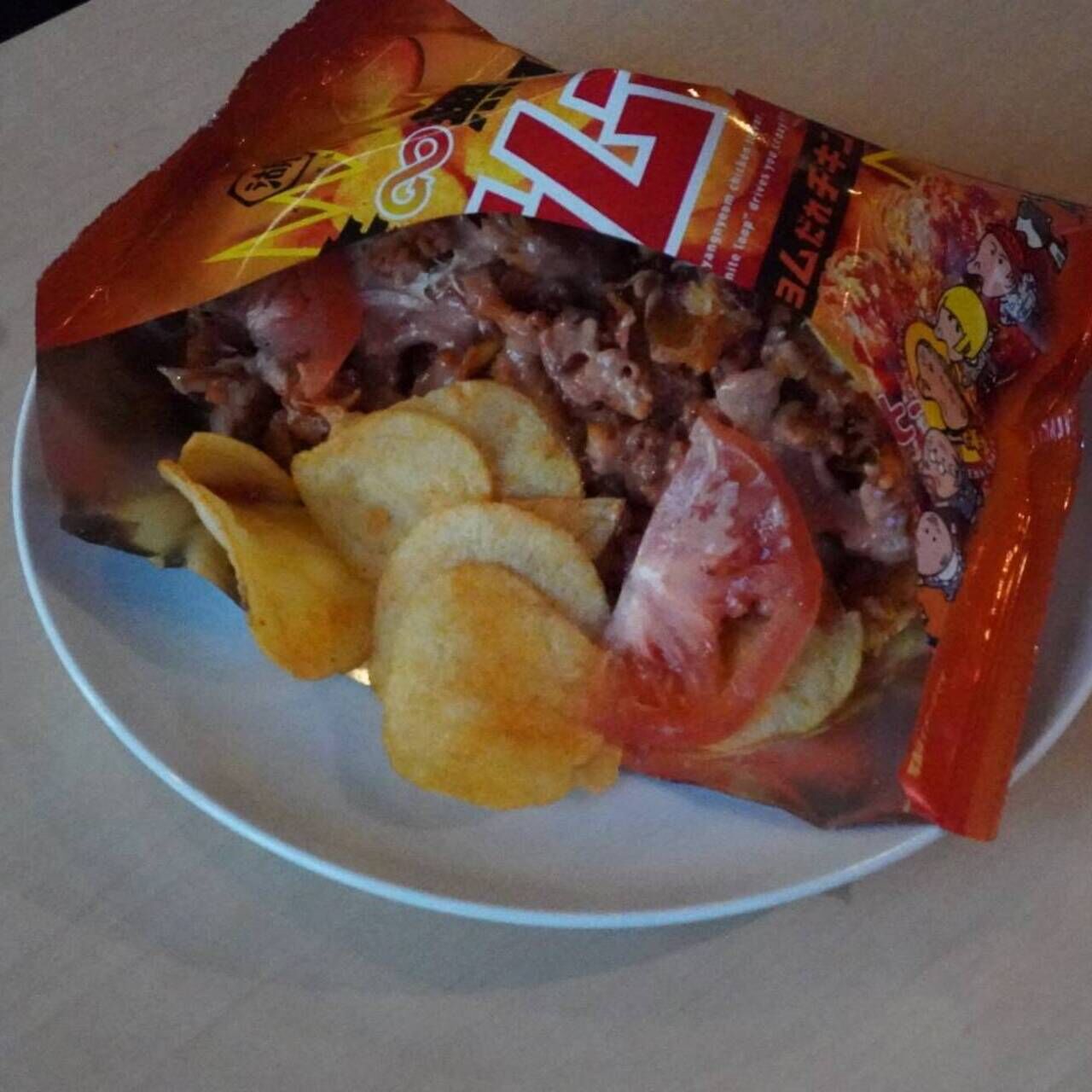 チップスにお肉、キャベツ、トマトを入れ混ぜて食べると新食感を楽しめます
