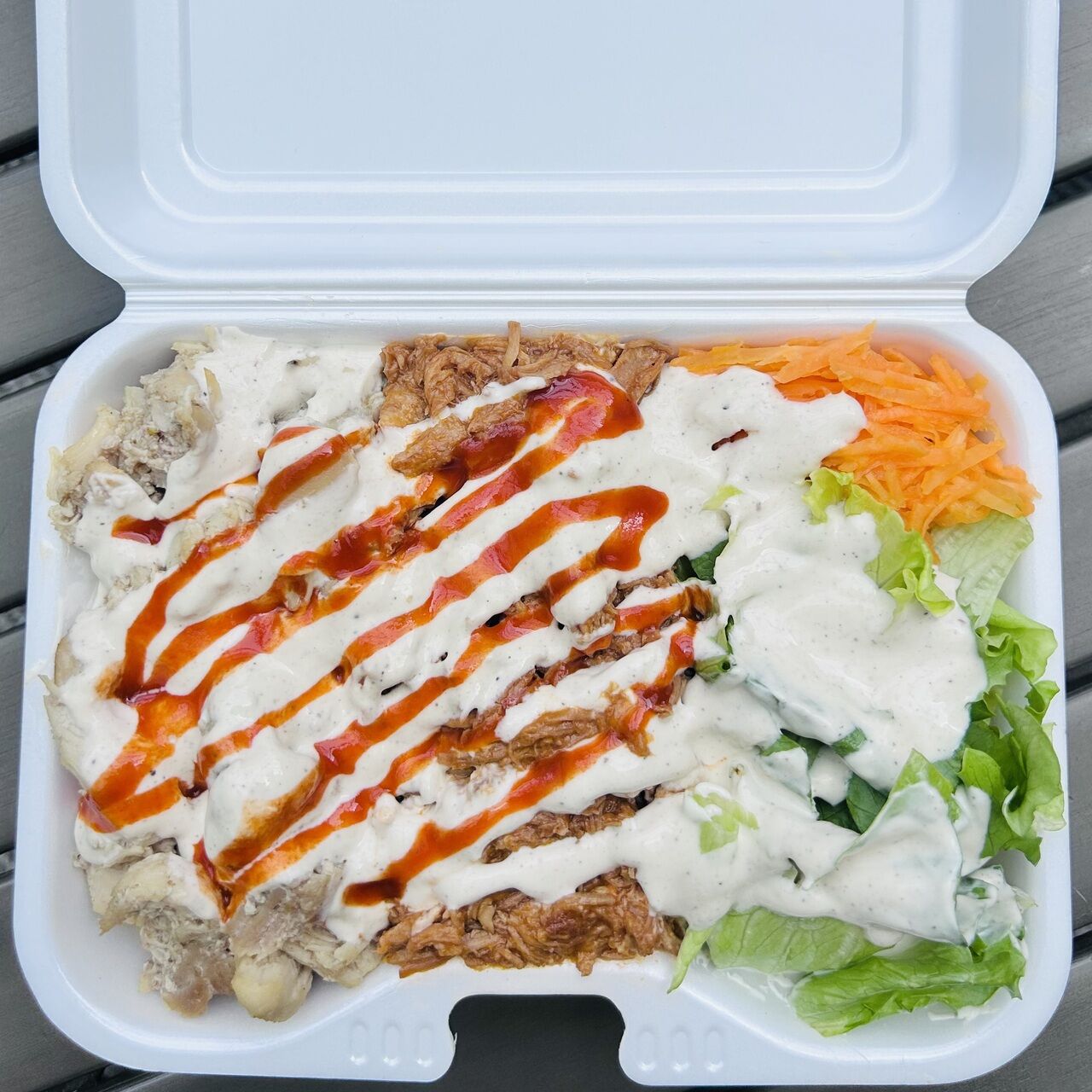 チキンとプルドポークを一緒に食べられる数量限定の相盛りメニューです。 無料トッピングソースは HOTソースまたはBBQソースからお選びください。