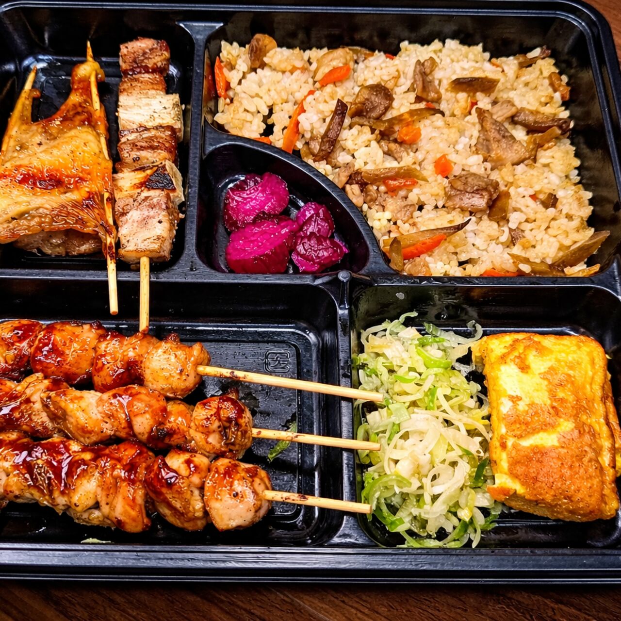 パパちゃんの拘り抜いた串4種盛り合わせ5本セット(モモ串2本/ボンジリ串/タレ、カワ串/豚ネギマ串/塩)+焼鳥五目御飯、自家製卵焼きにネギ塩を添えて^_^